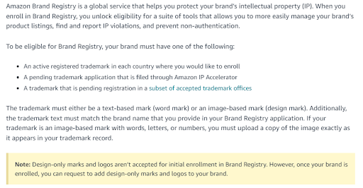 You need a registered trademark and an active Seller Central or Vendor Central account. Visit the Brand Registry enrollment page to start.