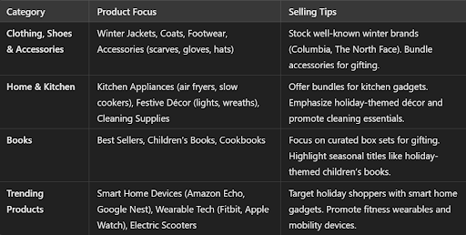 Amazon Canada’s Black Friday and Christmas sales are known for discounts across various categories, making it essential for sellers to understand which products are hot during this period. Below are the key categories that are expected to see high demand: