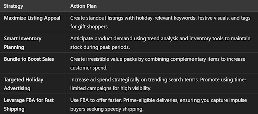 Optimize Listings Ensure your product listings are fully optimized with relevant keywords, high-quality images, and holiday-focused descriptions. Consider adding gift-related tags to attract buyers looking for presents.