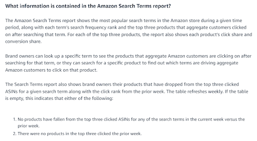 Search Term Report: Available for the past 60 days. Pull this report every week or bi-weekly to stay updated on recent search term performance.
