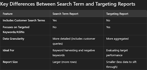 The Targeting Report focuses on the performance of the keywords, ASINs, and categories you are actively targeting in your Sponsored Products campaigns. Unlike the Search Term Report, it does not include customer search terms but provides aggregated data on your chosen targets.