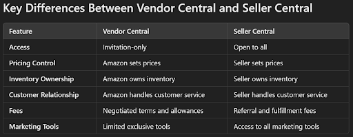Vendor Central is an invite-only platform where you sell products wholesale to Amazon, while Seller Central allows you to sell directly to consumers on Amazon's marketplace.