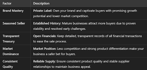 Business Type: The nature of your business, whether it is a private label or reselling brand-name products, significantly affects the attractiveness to buyers. Private label businesses, where you own and control the brand, are often more appealing as they offer greater growth potential and lower competition.