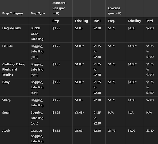 Per-Unit Fees: Compare the per-unit costs for basic services like labeling and packaging. Be aware of any minimum fees for specific prep categories, such as fragile or sharp items.