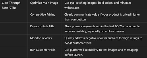 You can improve your CTR by optimizing your main image, setting competitive prices, refining your product title, and ensuring strong reviews. Conducting customer polls can also help determine what resonates most with potential buyers. -