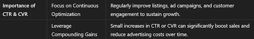 CTR and CVR are crucial because they determine how well your product matches what customers are looking for. Higher CTR and CVR indicate relevance and quality, leading to better rankings, more organic sales, and lower advertising costs.