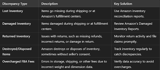 Discrepancies can arise due to lost inventory, damages, returns, destruction, or overcharged fees during storage and shipping. -