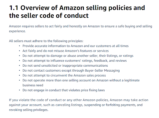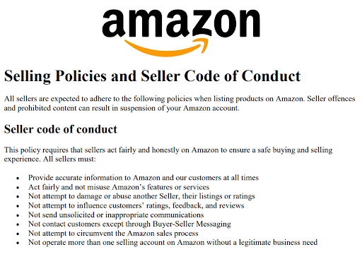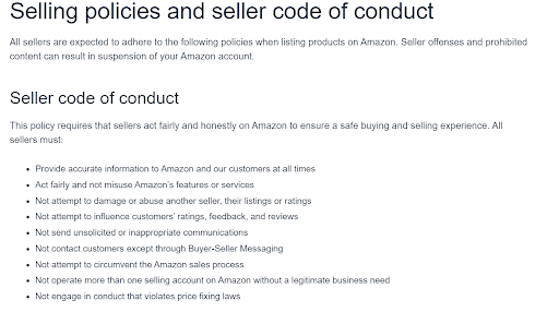- Policy violations: Many sellers often overlook the details of Amazon’s policies including selling policies, code of conduct, terms of use and conditions of use. Engaging in practices like artificially boosting product reviews can quickly get your account into hot water.