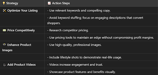 Understanding and optimizing BSR is pivotal for Amazon success. By combining actionable strategies like listing optimization, competitive pricing, and enhanced visuals, you can elevate your product’s ranking and boost sales.